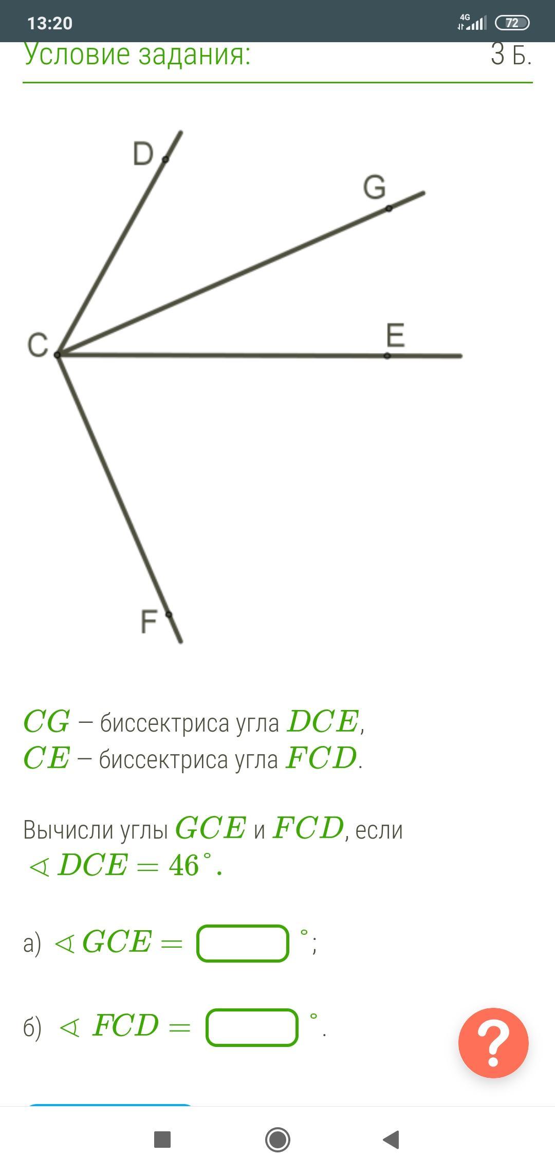 CG — биссектриса угла DCE, CE — биссектриса угла FCD. Вычисли углы GCE и FCD, если ∢DCE=46°.