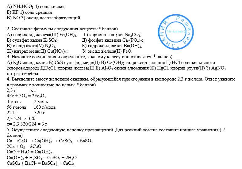 В) NO 1) соль средняя 2) оксид кислотный 3) оксид несолеобразующий 4) соль кислая