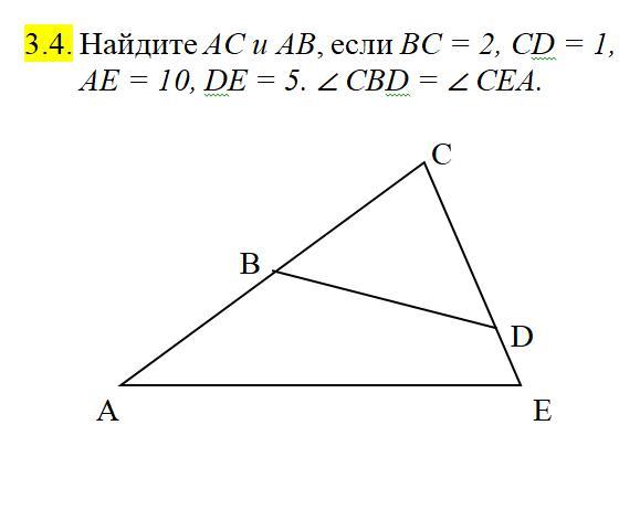 Найдите АС и АВ, если ВС = 2, СD = 1, АЕ = 10, DЕ = 5. ∠ СВD = ∠ СЕА.