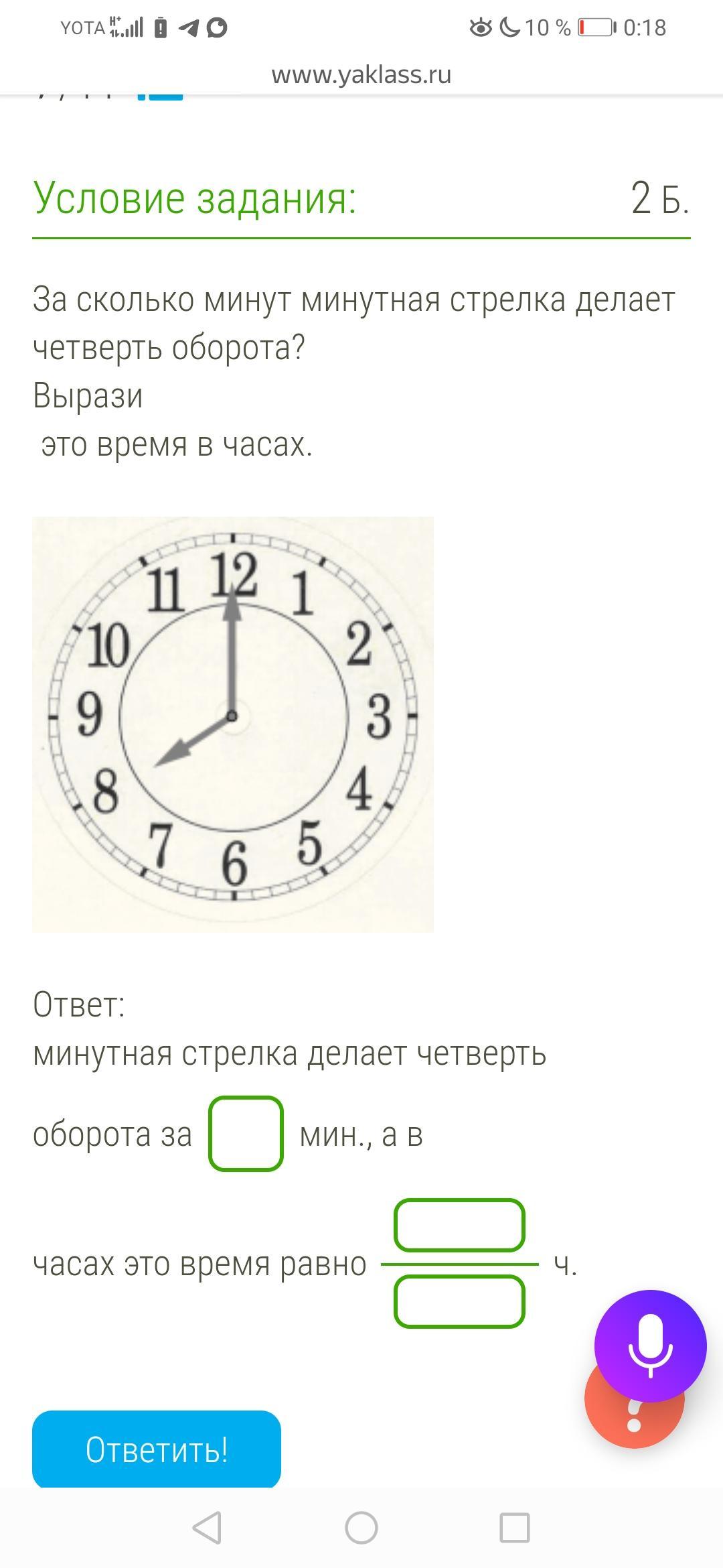 Четверть оборота 60/4=15 минут=15/60=1/4 часа.