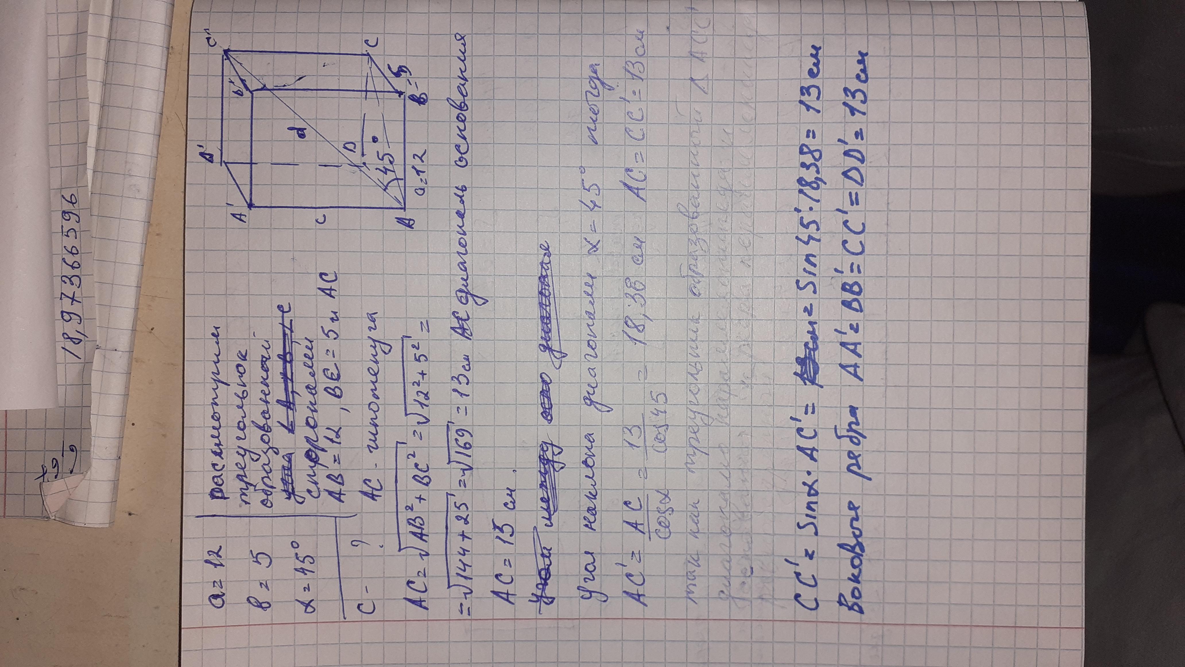 діагональ паралелепіпеда нахилена до площини основи під кутом 450