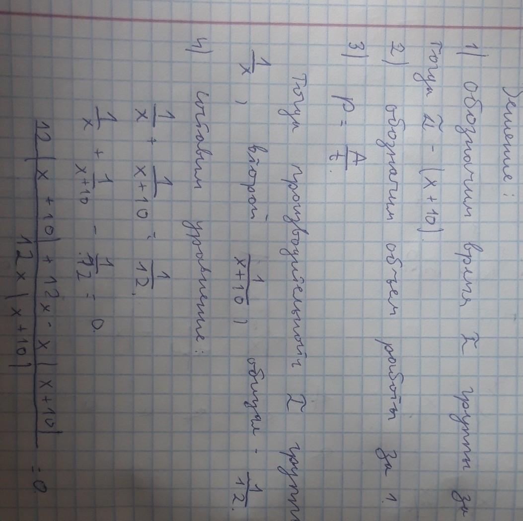 Две группы специалистов работая одновременно над монтажом и установкой современного медицинского оборудования выполнили это задания за 12дней. Сколько дней понадобилось бы каждой группе при условии что они работали изолированно если одна из групп выполнила задание на 10 дней быстрее чем вторая?