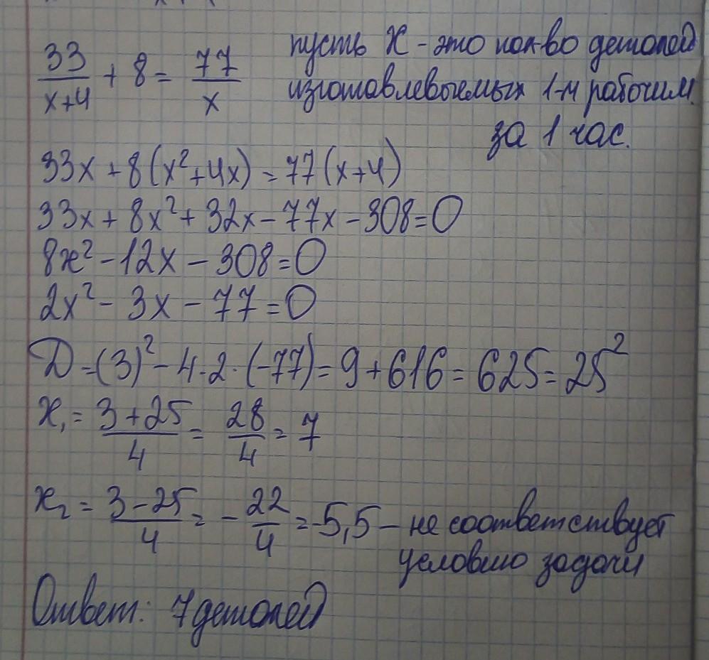 Задание 11. На изготовление 33 деталей первый рабочий тратит на 8 часов меньше, чем второй рабочий на изготовление 77 таких же деталей. Известно, что первый рабочий за час делает на 4 детали больше, чем второй. Сколько деталей за час делает второй рабочий?