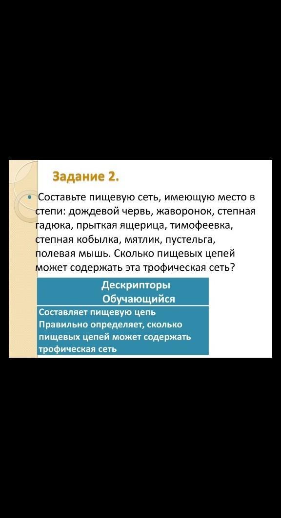 Помогите срочно!!! Нужно создать пищевую цепь и определить сколько пищевых цепей может содержать трофическая сеть.