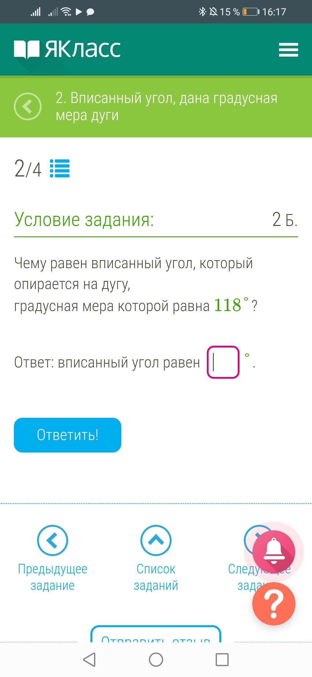 Тогда угол, опирающийся на дугу 118° = 118° : 2 = 59°.