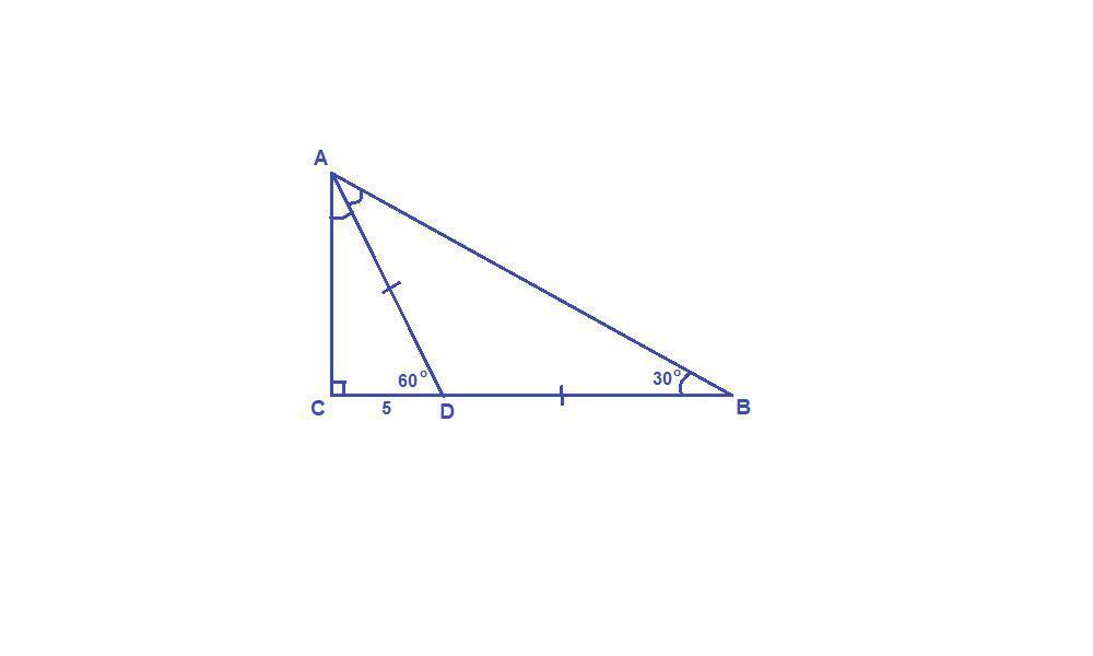 В треугольнике АBC известно, что угол С = 90 градусов, угол B = 30 градусов. На катете BC обозначили точку D так, что угол АDC = 60 градусов. Найдите катет BC, если CD = 5 см