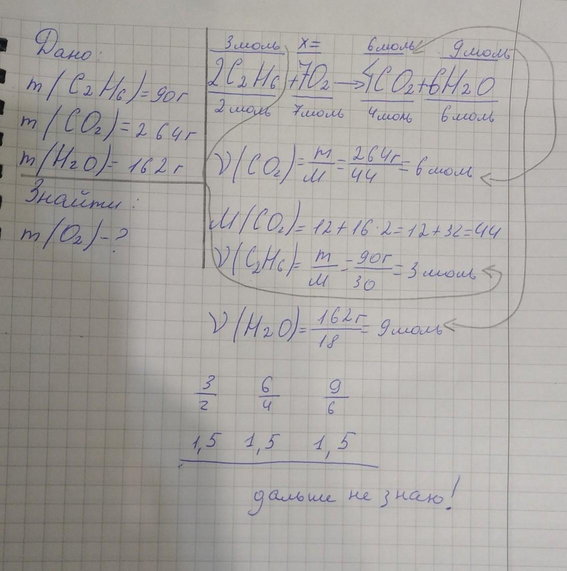 Під час спалювання етану C2H6 масою 90 г утворилися вуглекислий газ масою 264 г і вода масою 162 г. Складіть рівняння відповідно реакції. Обчисліть масу кисню, що прореагував