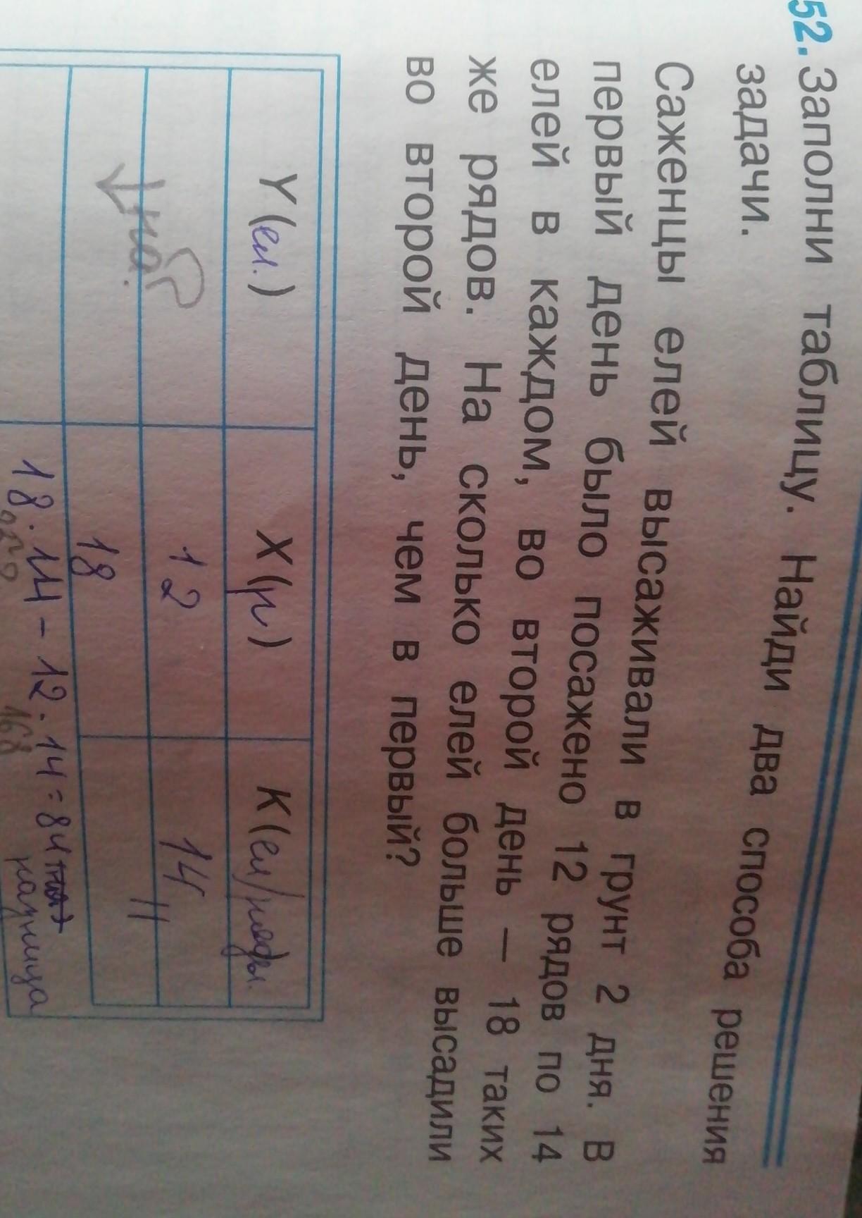4) 252-168=84 - на столько елей больше высадили во второй день