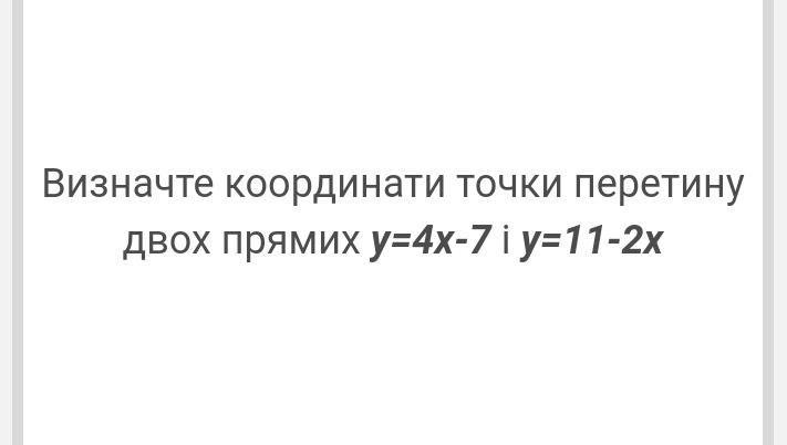 Визначте координат точки перетину двох прямих y =4x-7 і y =11-2x