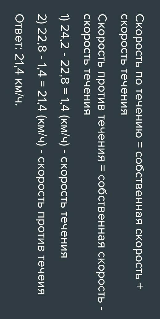 скорость катера по течению реки равна 24,2 км/ч, а собственная скорость катера 22,8 км/ч. найдите скорость катера против течения реки.
