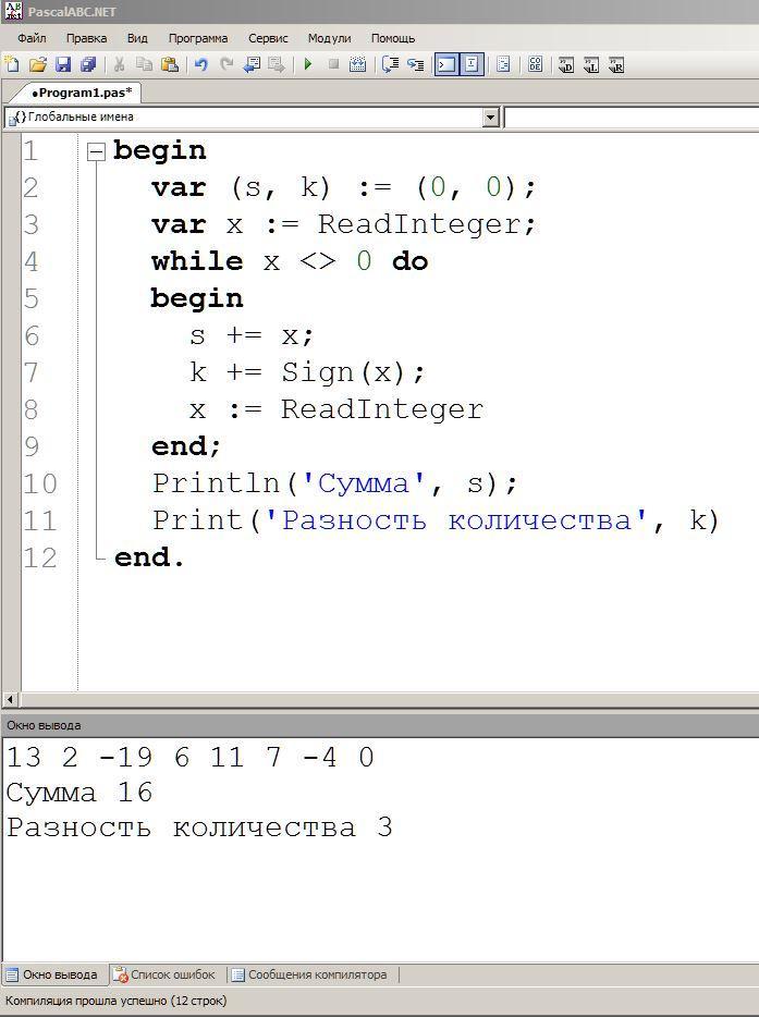 Количество чисел не превышает 1000. Введённые числа по модулю не превышают 30 000. Программа должна вывести два числа: сумму чисел и разность количества положительных и отри-цательных чисел.(паскаль)