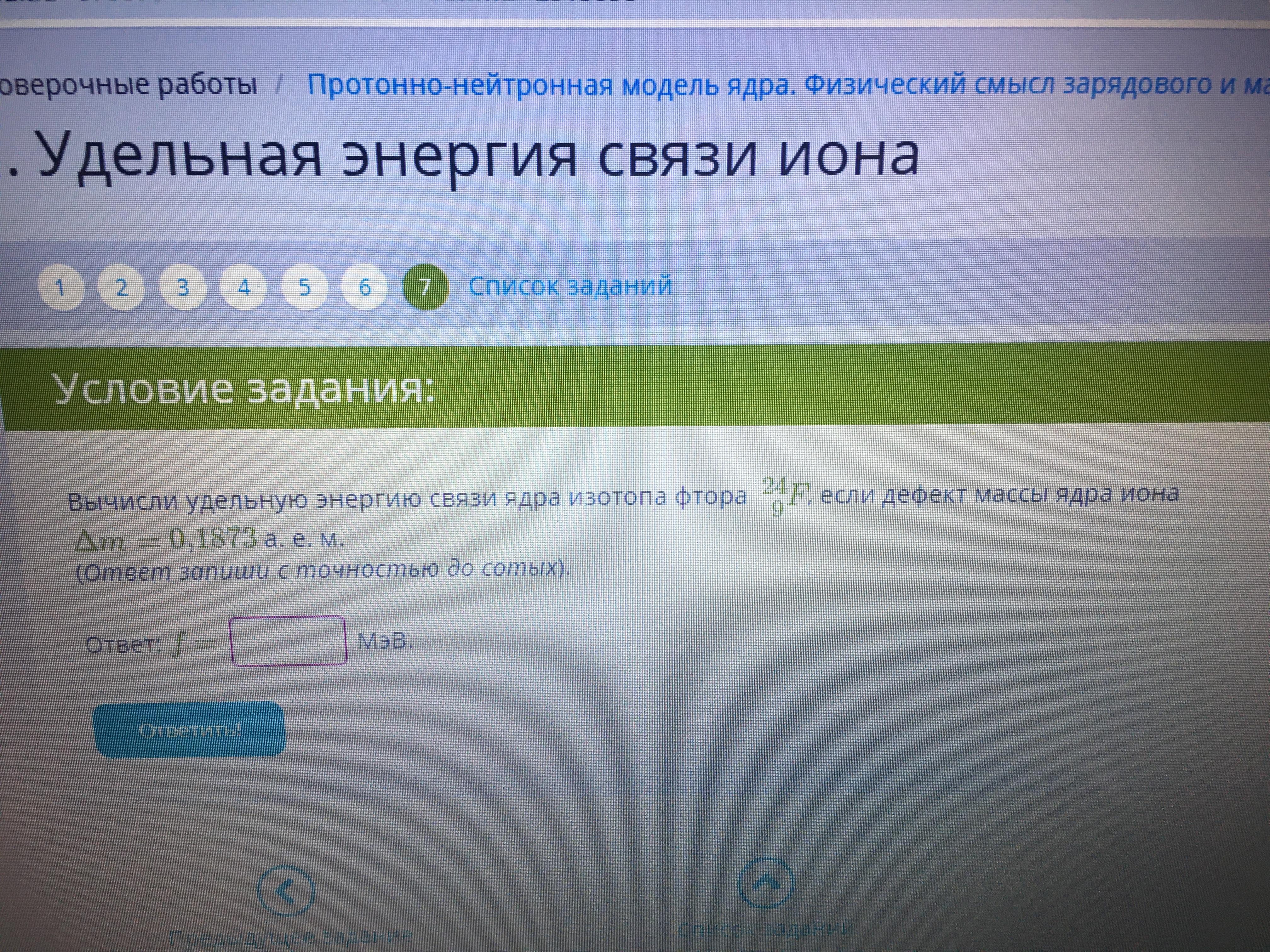 Вычески удельную энергию связи ядра изотопа фтора 24/9 F, если дефект массы ядра иона Дельта m=0,1873 a.e.m.