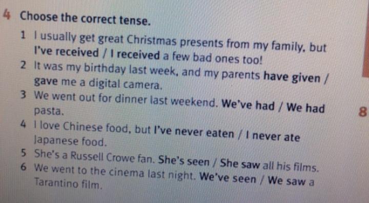объяснение: в задании на выбор предоставляются времена past simple и present perfect. past simple используется тогда, когда из контекста известно, когда произошло действие — например, на прошлой неделе, вчера, и так далее. present perfect же употребляется в случае, когда нам неизвестно время, когда было совершенно действие, или когда-то говорится об общем опыте, например — я никогда не видел его фильмов (i've never seen his films), я никогда не ощущал что-то столь прекрасное (i've never experienced anything this beautiful).