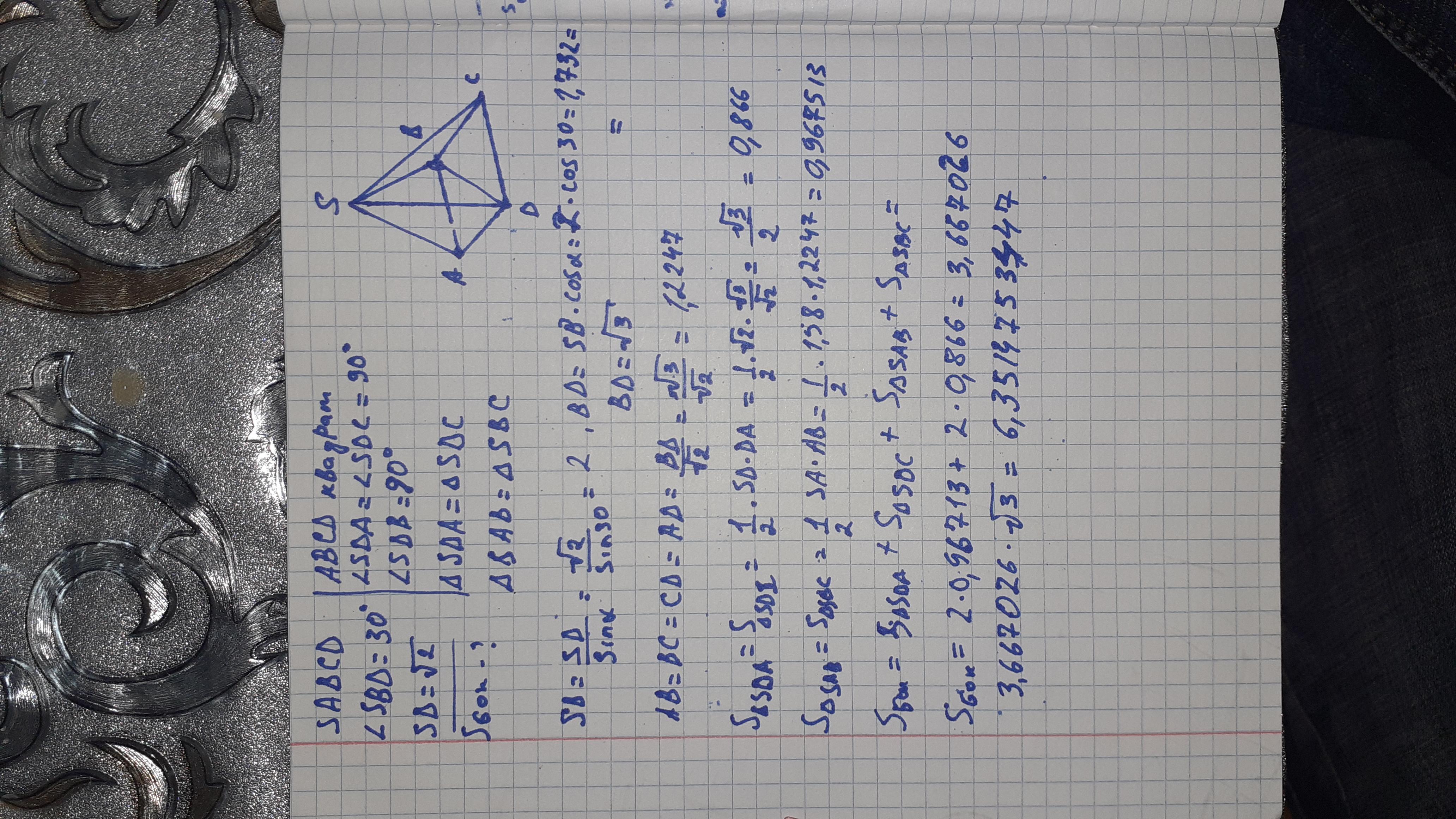 В четырехугольной пирамиде, в основании которой лежит квадрат, две боковые грани перпендикулярны к плоскости её основания, а одна из оставшихся боковых граней составляет с основанием угол 30∘. Высота пирамиды равна корень из 2. Найдите площадь боковой поверхности пирамиды. В ответ запишите число, умноженное на корень из 3