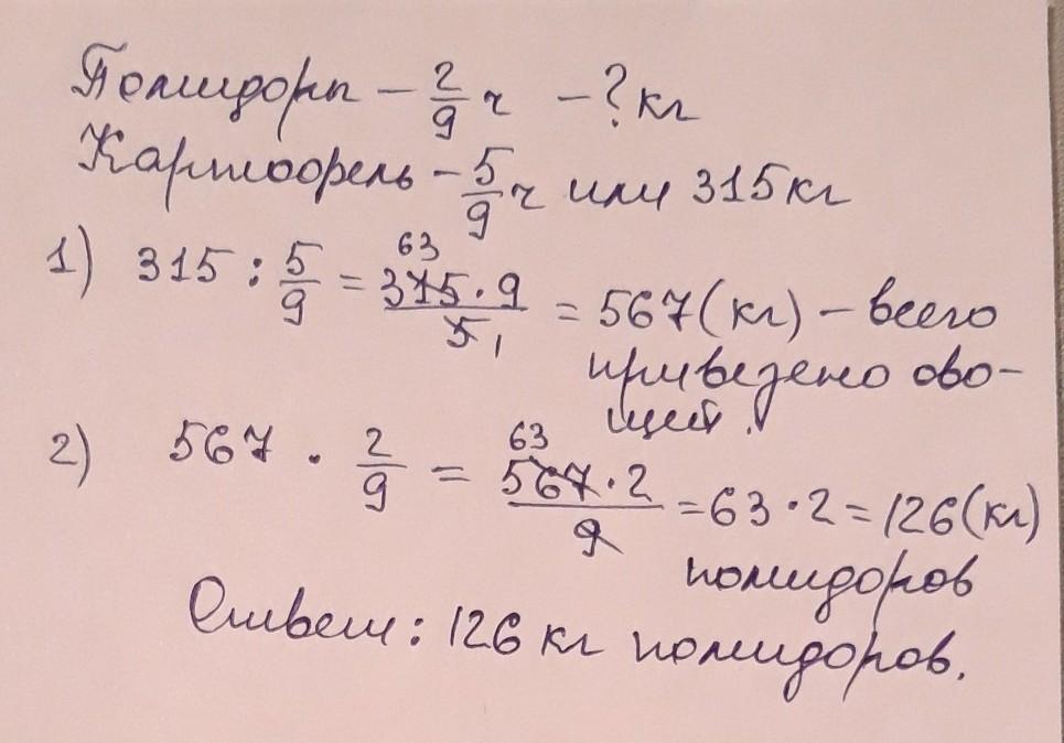 В магазин завезли овощи. Две девятых всех овощей — помидоры, а пять девятых всех овощей — картофель. Сколько килограммов помидоров завезли в магазин, если картофеля завезли 315 кг?