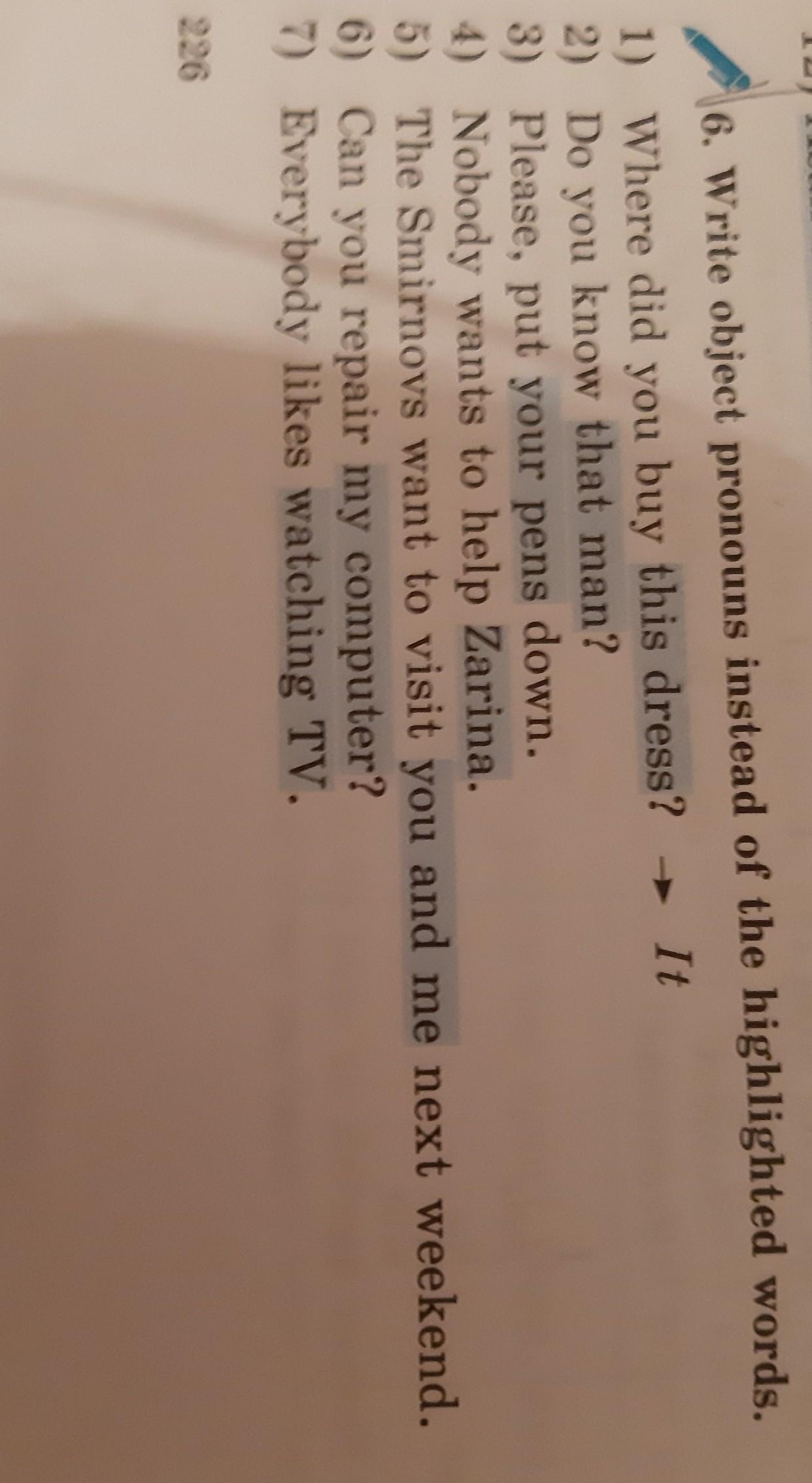 Write objects pronouns instead of the highlighted words. Перевод: Напишите объекты местоимения вместо выделенных слов.