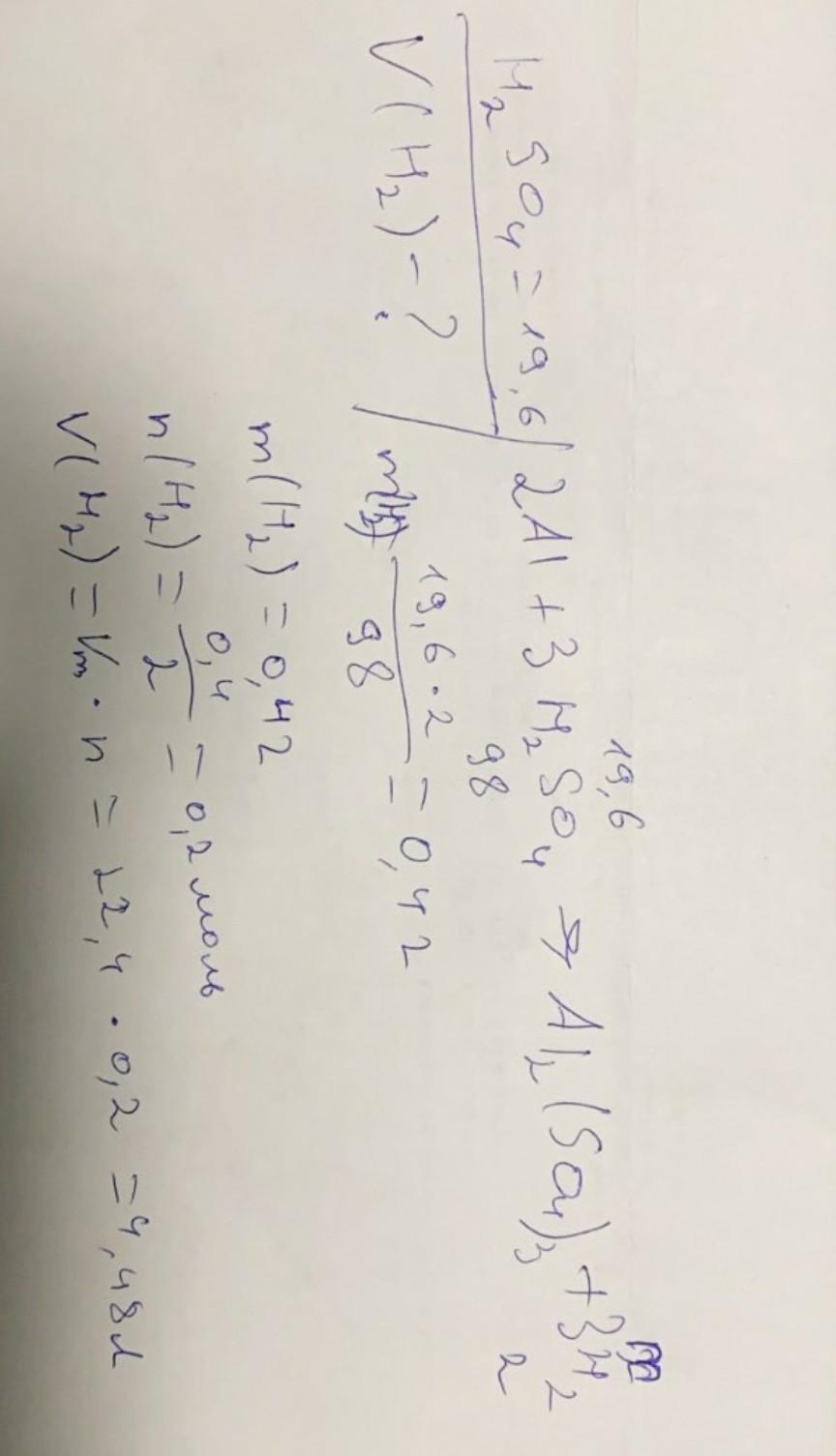 Який об'єм водню (н. у.) виділиться під час взаємодії алюмінію з розчином в якому міститься 19,6 г сульфатної кислоти?