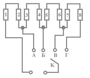 На рисунке изображён ступенчатый реостат, в котором сопротивление всех резисторов одинаково и равно 9 Ом каждый.