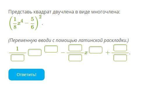 (1/8 x⁴-5/6)²= по формуле квадрата разности (а-в)²=а²-2ав+в²