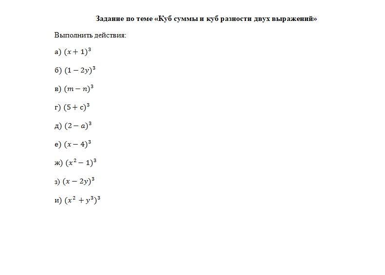 Объяснение: а) (х+1)³ = х³+3х²+3х+1 б) (1-2у)³= 1 -3·1²·2у +3·1· (2у)² -(2у)³= 1 - 6у+12у²- 8у³ в) (m-n)³= m³-3m²n + 3mn² - n³ г) (5+с)³= 125+75с+15с²+с³ д) (2-а)³= 8 - 12а+6а² - а³ е) (х-4)³= х³ - 12х²+48х-64 ж) (х²-1)³ = х⁶ - 3х⁴+3х² -1 з) (х-2у)³ = х³ - 6х²у+12ху² - 8у³ и) (х²+у³)³ = х⁶+3х⁴у³+3х²у⁶+у⁹