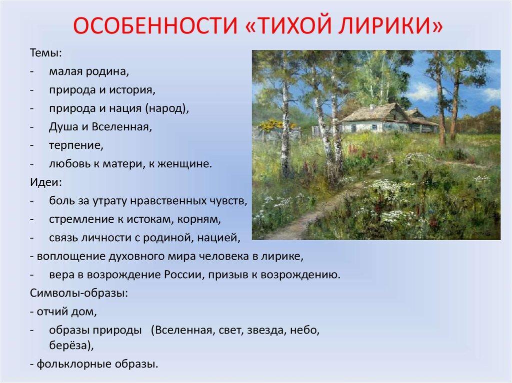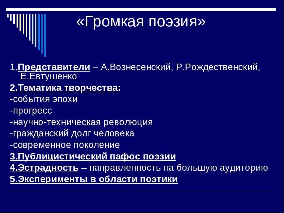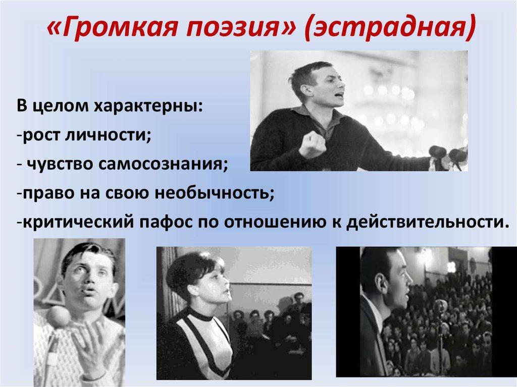 В 1960-е гг. появился термин « тихая поэзия ». Он родился в противовес громкой, эстрадной поэзии и связанному с ними поэтическому буму, а одновременно и в противовес книжности.