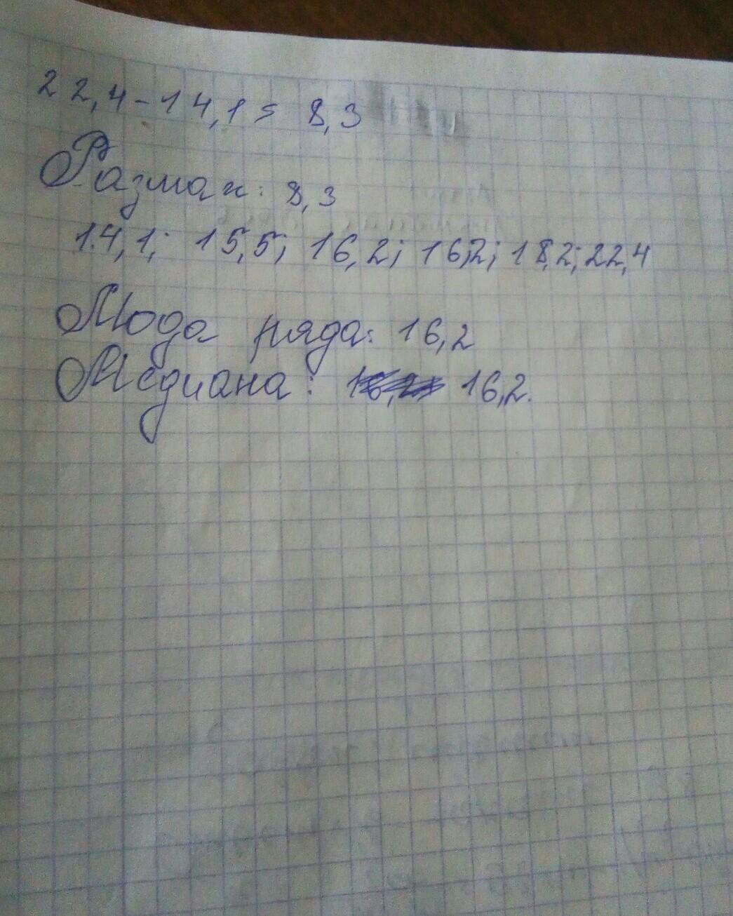Медиана: 14,1 ; 15,5 ; 16,2 ; 16,2 ; 18,2; 22,4 (определение №1 - число стоящее в середине вариационного ряда, состоящего из нечетного числа вариантов (здесь четное число вариантов, поэтому, обращаемся ко 2 определению))