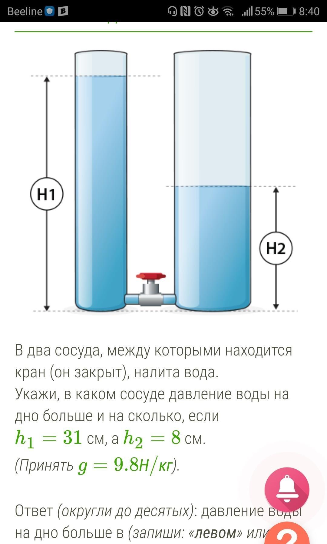 Укажи, в каком сосуде давление воды на дно больше и на сколько, если h1=31 см, а h2=8 см.