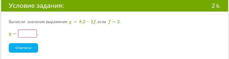 Вычисли значение выражения y=8,2−2f, если f=2.