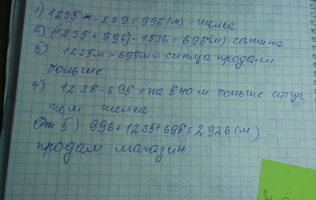 Магазин продал 1235 м ситца, шёлка - на 239 м меньше, чем ситца, а сатина - на 1536 м меньше, чем ситца и шёлка вместе. Сколько метров ткани продал магазин? Ситца или сатина было продано больше и на сколько метров больше?