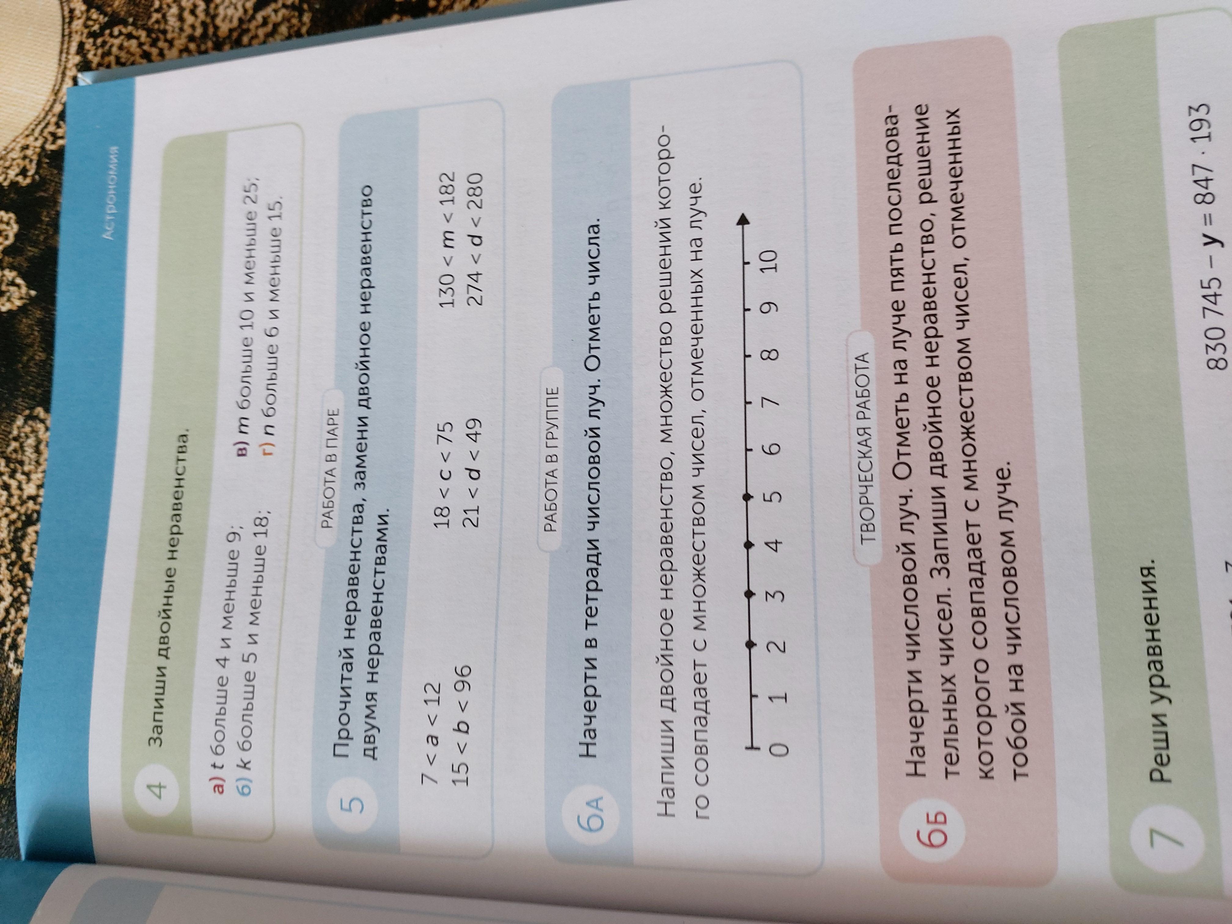 Начерти числовой луч. Отметь на луче пять последовательных чисел. Запиши двойное неравенство, решение которого совпадает с множеством чисел, отмеченных тобой на числовом луче.