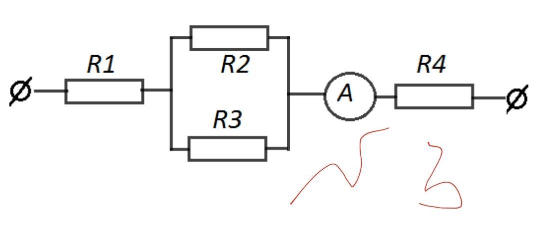 3.Знайти розподіл струмів і напруг між опорами, якщо амперметр показує 5 А, R1 = 2 Ом, R2 = 10 Ом, R3 = 15 Ом, R4 = 4 Ом.