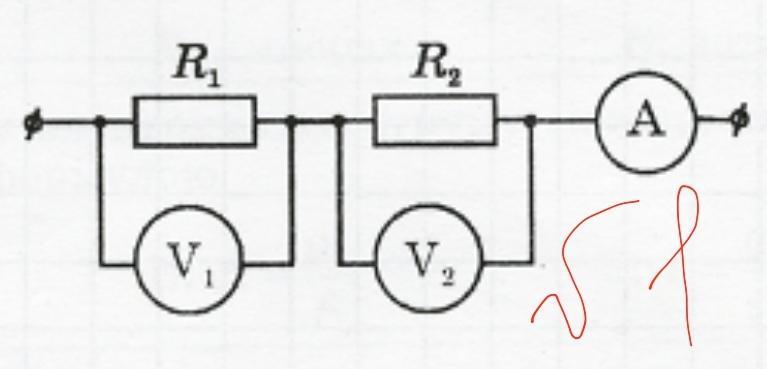 1.Вольтметр V1 показує 2 В. Знайти показання амперметра та вольтметра V2, якщо опори резисторів R1 = 8 Ом, R2 = 1 Ом.