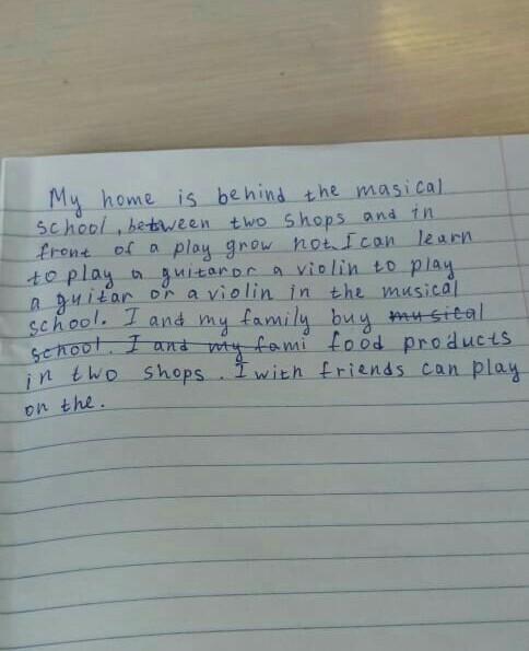 Мой дом находится за тай-масикальной школой, между двумя магазинами и перед пьесой расти не надо. Я могу научиться играть на гитаре или скрипке, чтобы играть на гитаре или скрипке в музыкальной школе. Я и моя семья покупаем продукты питания в магазинах. Я с друзьями могу поиграть на своем.