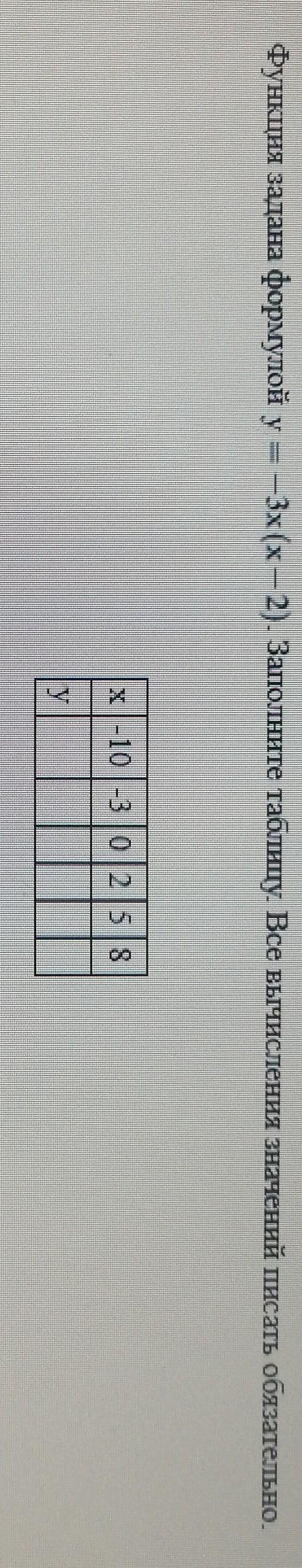 Функция задана формулой y= -3x(x-2).Заполните таблицу. Все вычисления значений писать обязательно.