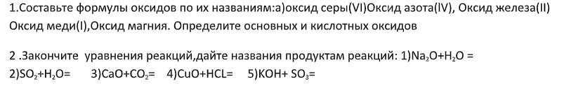 1) SO2- кислотный; 2)NO2- кислотный; 3)FeO- основный; 4)Cu2O- основный; 5)MgO - основный