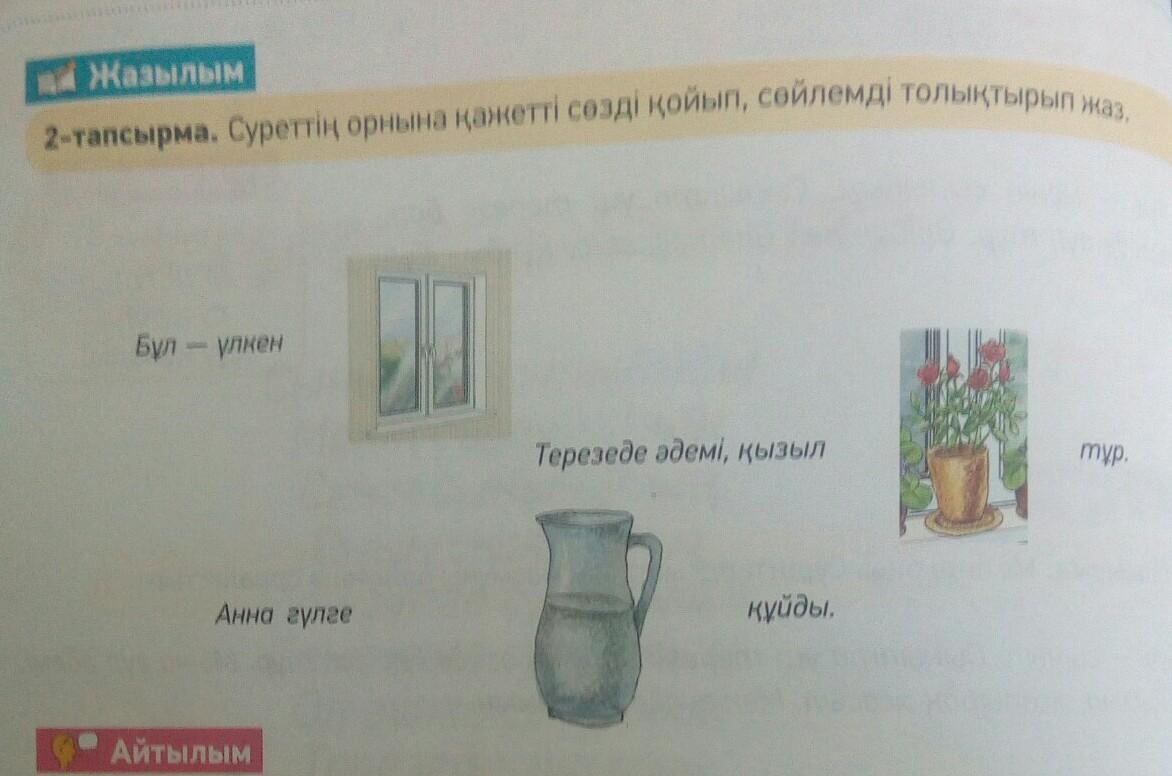 Бұл- үлкен терезе. Терезеде әдемі, қызыл гүл тұр. Ана гүлге су құйды.