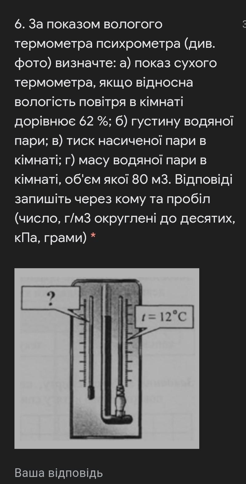 За показом вологого термометра психрометра (див. фото) визначте: а) показ сухого термометра, якщо відносна вологість повітря в кімнаті дорівнює 62 %%;B 6) густину водяної пари; в) тиск насиченої пари в кімнаті; г) масу водяної пари в кімнаті, об'єм якої 80 м3. Відповіді запишіть через кому та пробіл (число, г/м3 округлені до десятих, КПа, грами) *