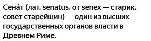 Сенат--один из высших государственных органов в Древнем Риме. Возник из совета старейшин патрицианских родов в конце царской эпохи (около VI века до н. ... Члены сената делились на ранги в соответствии с ранее занимаемыми должностями (консулы, преторы, эдилы, трибуны, квесторы).
