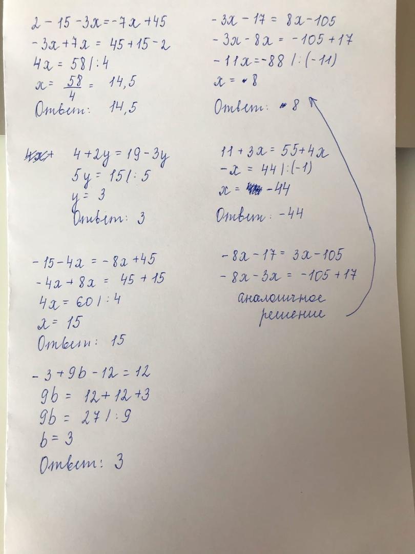 Ребята, выполните задания по математике 2–15 – 3х = –7х + 45; –3х – 17 = 8х – 105. 4 + 2y = 19 – 3y; 11 + 3х = 55 + 4х; –15 – 4х = –8х + 45; –8х – 17 = 3х – 105. –3 + 9b – 12 = 12.