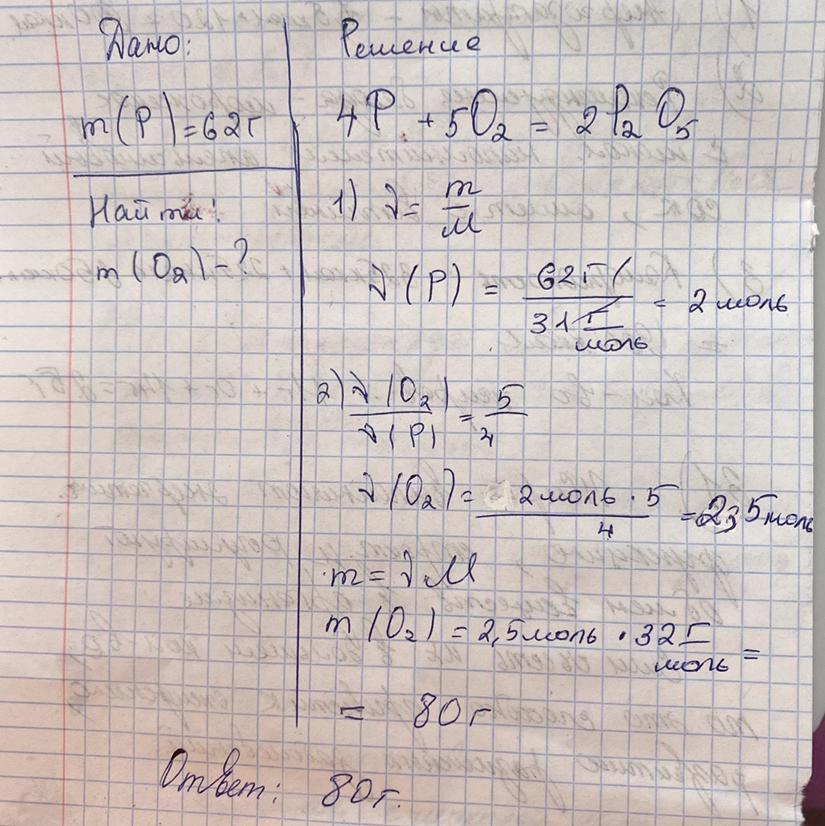 Задача: Определить массу кислорода , затраченного на реакцию с 62 г фосфора.
