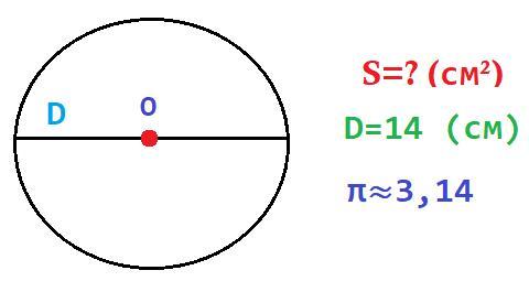Только вспомнив формулу нахождения площади круга по диаметру, мы сможем найти площадь круга. Запишем формулу и подставим вместо букв данные значения.