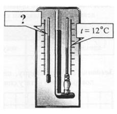 За показом вологого термометра психрометра (див. фото) визначте: а) показ сухого термометра, якщо відносна вологість повітря в кімнаті дорівнює 62 %; б) густину водяної пари; в) тиск насиченої пари в кімнаті; г) масу водяної пари в кімнаті, об'єм якої 80 м3. Відповіді запишіть через кому та пробіл (число, г/м3 округлені до десятих, кПа, грами) *
