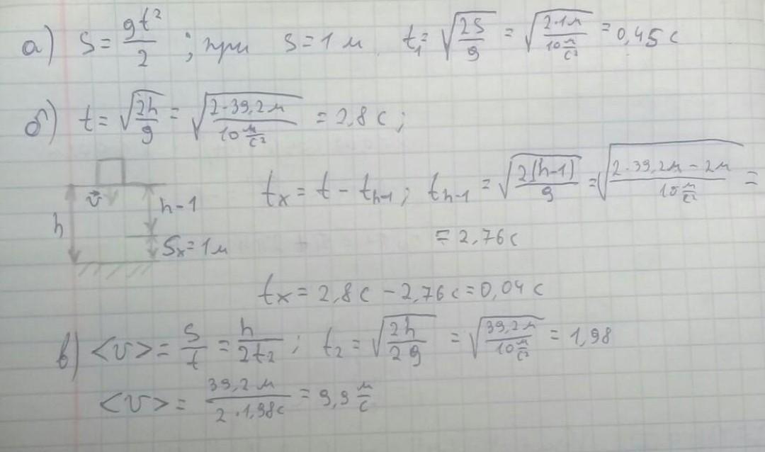 тіло вільно падає зі стану спокою з висоти 39,2 м.З а який час тіло пройде :а) перший метр свого шляху;б)останній метр свого шляху?Чому дорівнює середня швидкість на другій половині шляху?
