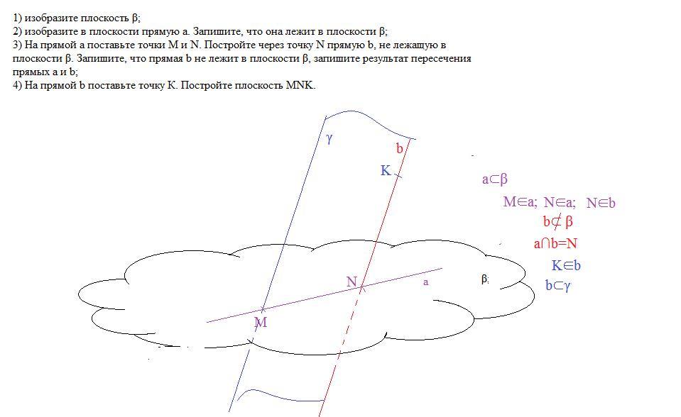 2) изобразите в плоскости прямую а. Запишите, что она лежит в плоскости β;