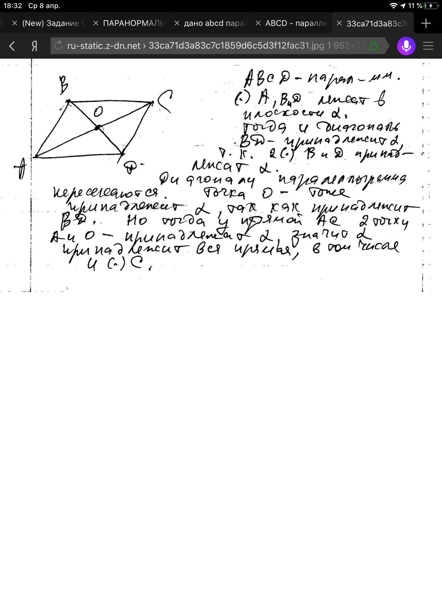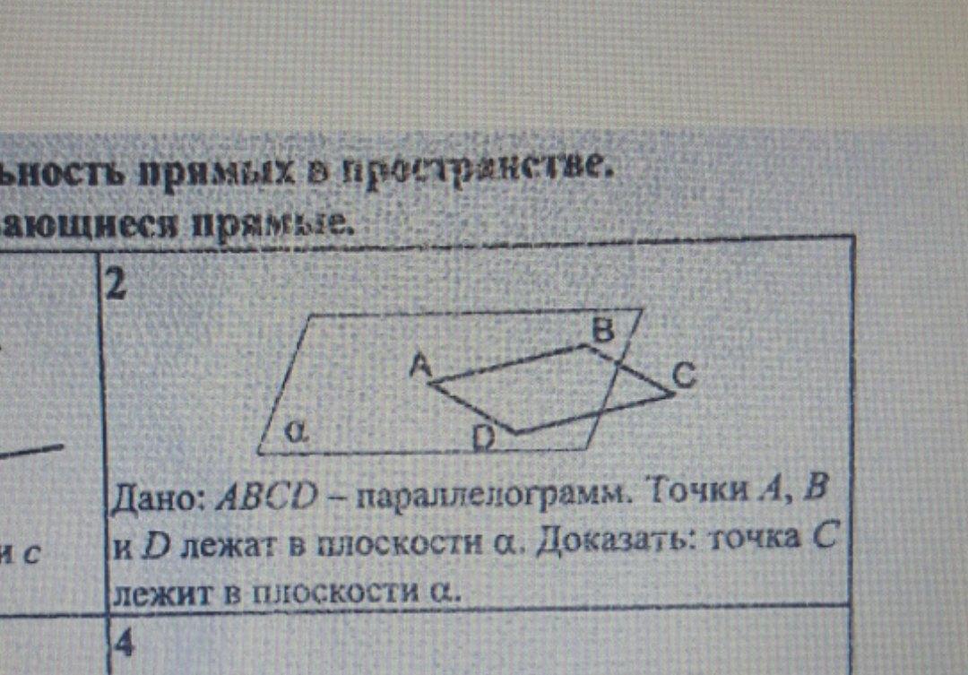 ABCD- параллелограмм. Точка А, В и D лежат в плоскости альфа. Доказать: точка С лежит в плоскости альфа