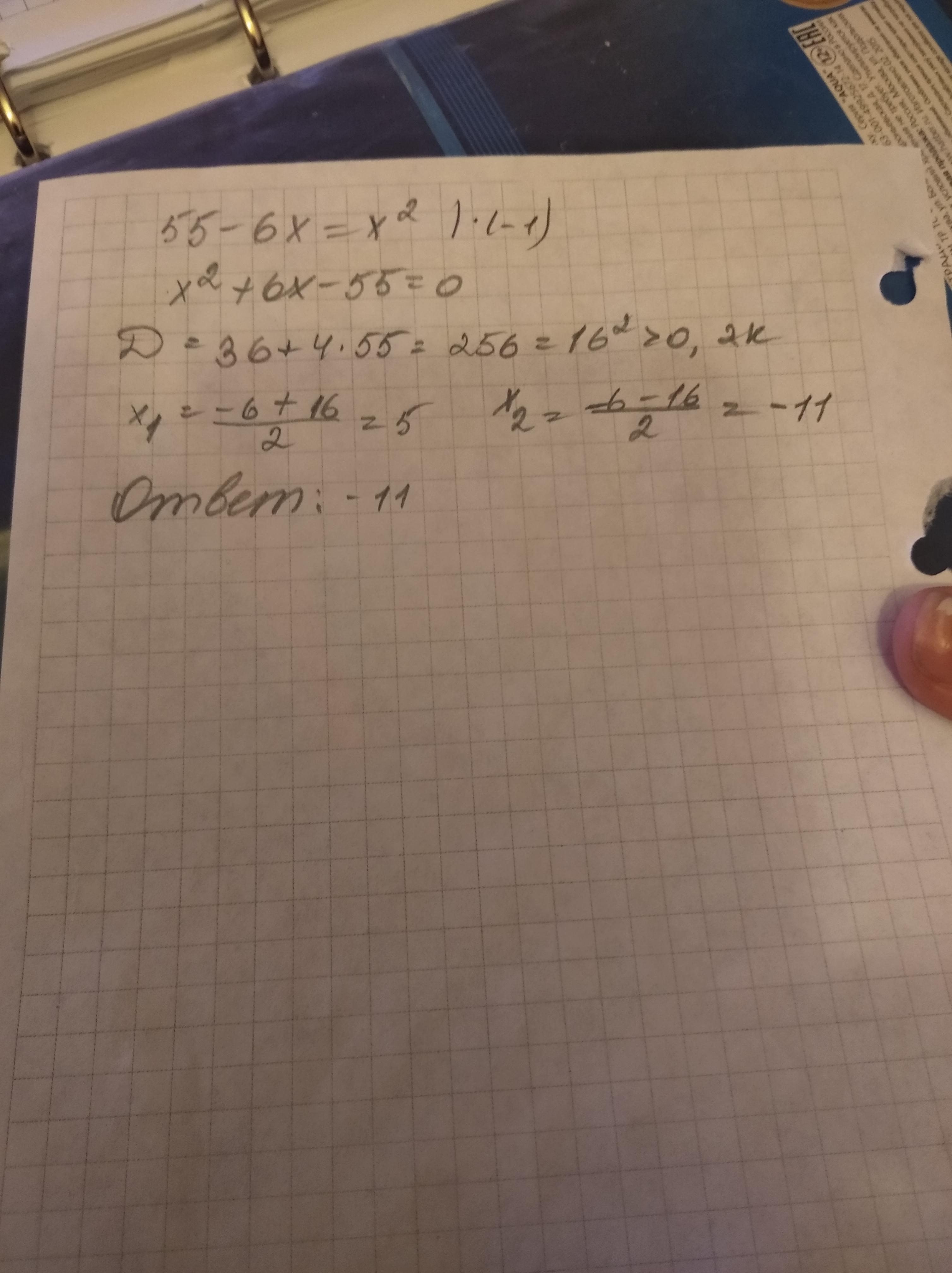 Решите уравнение 55-6x =x² . Если уравнение имеет более одного корня, в ответ запишите меньший из корней.