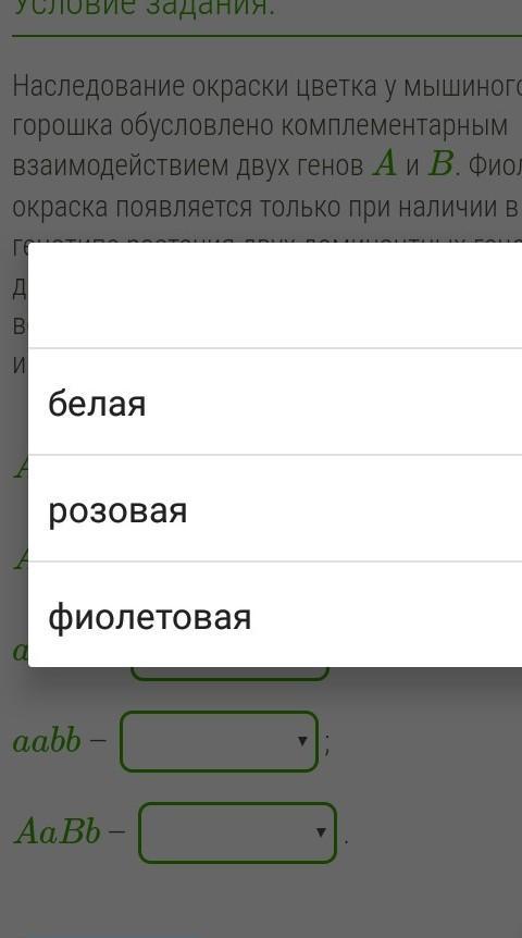 Наследование окраски цветка у мышиного горошка обусловлено комплементарным взаимодействием двух генов A и B. Фиолетовая окраска появляется только при наличии в генотипе растения двух доминантныбх генов. Все другие сочетания генов определяют белый венчик. Укажи окраску цветков у растений, имеющих следующие генотипы: