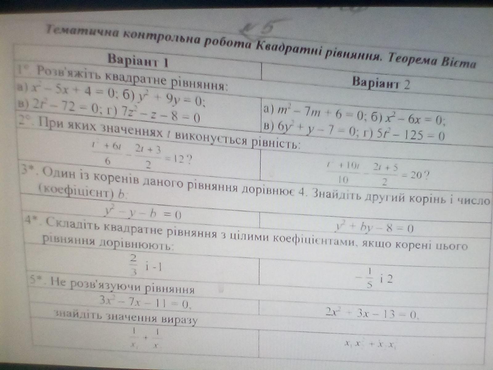 Решите контрольную по квадратным уровнениям 1 вариант