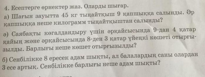 ә)саябақты көгалдандыру үшін әрқайсысында 9 дан 4 қатар дайын және арқасында 8 ден 3 қатар үйеңкі көшеті отырғызылады. Барлығы неше көшет отырғызылды?
