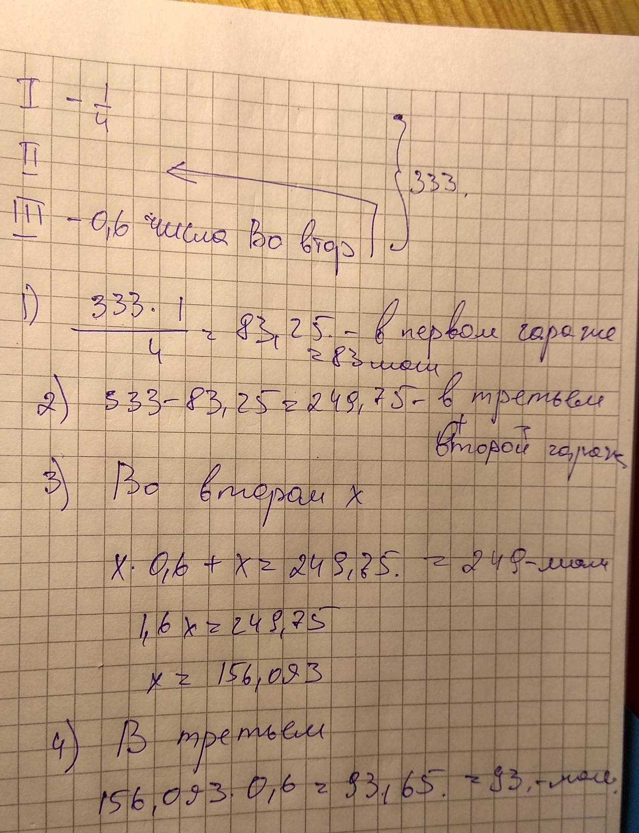 В трёх гаражах 333 машин.Число машин в первом гараже составляет 1/4,а в третьем гараже 60%,числа машин во втором гараже.Сколько машин помещается в каждом гараже?